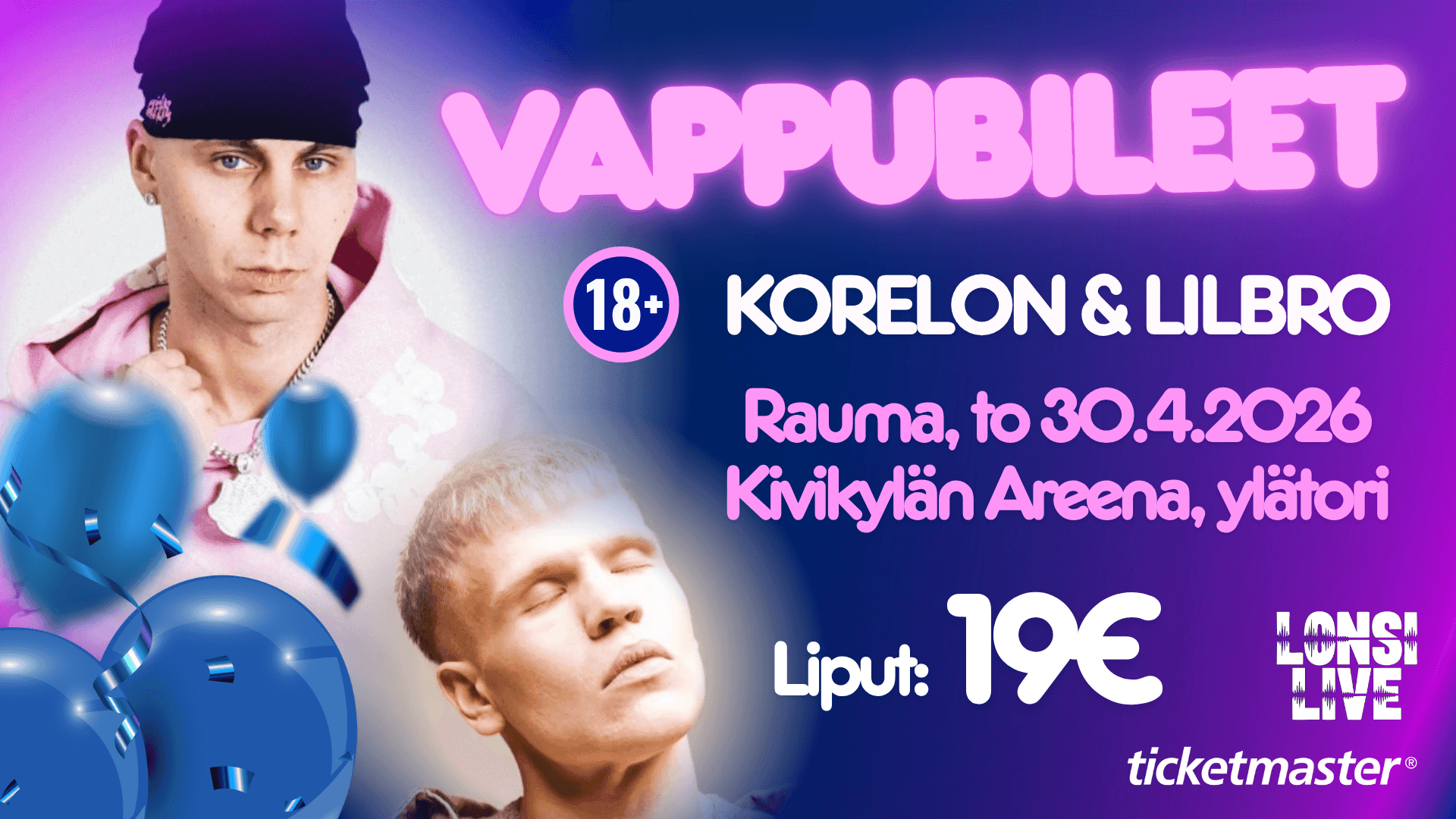 Kivikylän Areenan ylätorilla vietetään vappubileitä torstaina 30.4.2026. Lonsi Liven järjestämässä tapahtumassa nähdään huippuartistit Korelon sekä Lilbro. Tapahtuma on K18.
